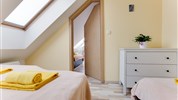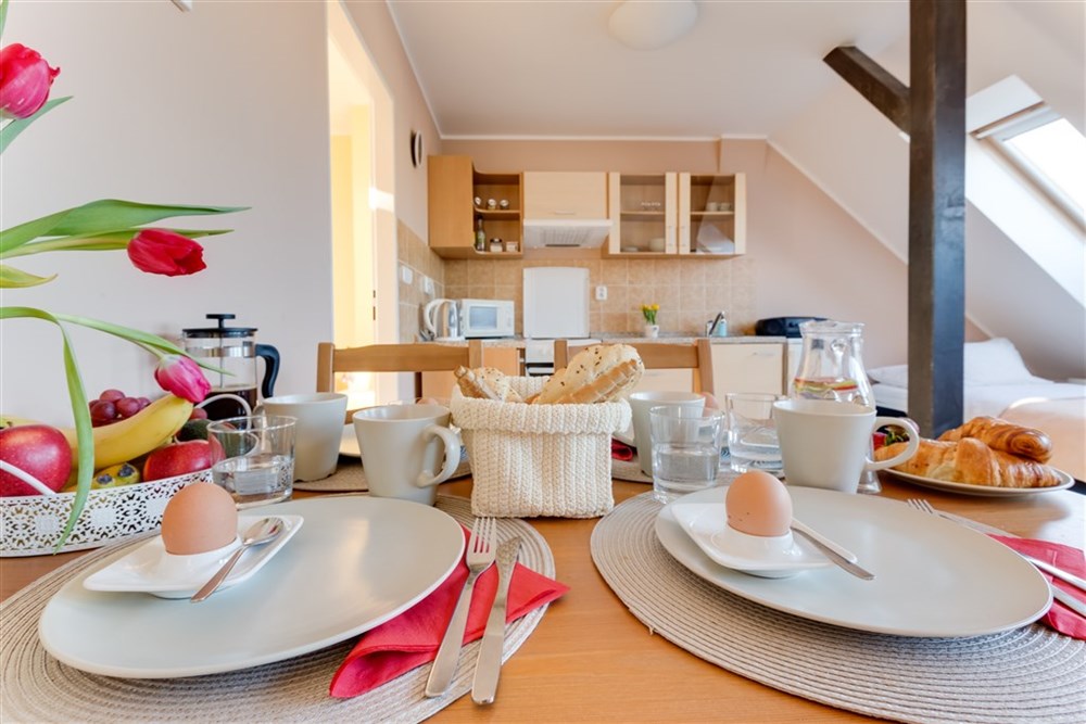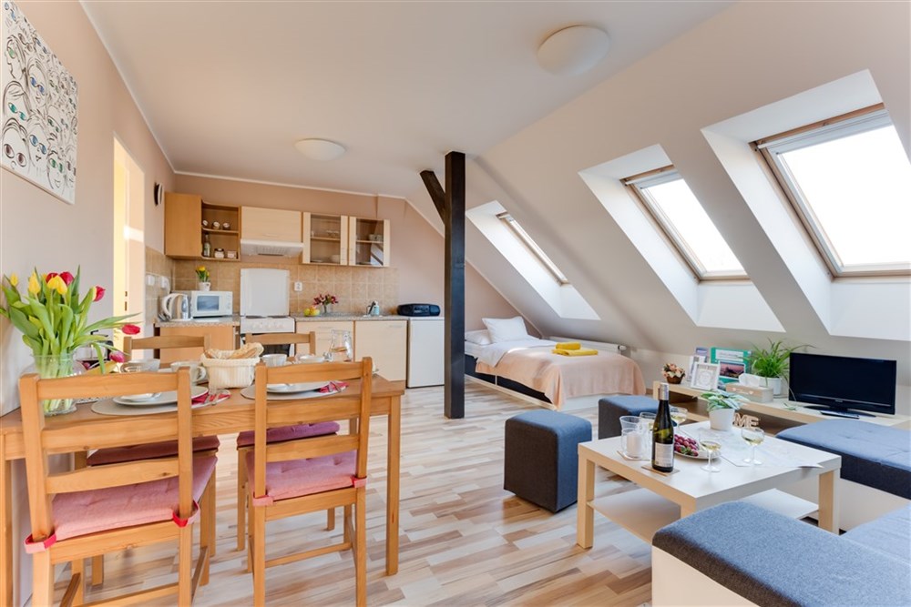 Apartmán č. 1 moderní 4lůžkový apartmán (ložnice se 3 lůžky - 2lůžková a 1lůžková postel), obývací pokoj s 1lůžkem a rozkládací pohovkou (možnost přistýlky 140x200 cm), vlastní soc. zařízení (sprcha, WC, fén), vybavená kuchyňka (lednice, sporák, mikrovlnná trouba, rychlovarná konvice, kávovar, topinkovač, toustovač, základní nádobí), TV-DVD, Wi-Fi (zdarma), pračka, žehlička a žehlící prkno, klimatizace.Apartmán č. 2 moderní 4lůžkový apartmán s možností přistýlky, vlastní soc. zařízení (sprcha, WC, fén), ložnice (2lůžková a 1lůžková postel), obývací pokoj s 1lůžkem a rozkládací pohovkou (možnost přistýlky 140x200 cm), plně vybavená kuchyňka (lednice, sporák, mikrovlnná trouba, rychlovarná konvice, kávovar, topinkovač, toustovač, základní nádobí), TV-DVD, Wi-Fi (zdarma), pračka, žehlička a žehlící prkno, klimatizace.Apartmán č. 3 2lůžkový apartmán s možností přistýlky (dvě místnosti - samostatná kuchyň a jídelní část a druhá místnost obývací s 2lůžkem (160 cm) a rozkládací pohovkou 140x200 cm), vlastní soc. zařízení (sprcha, fén, samostatné WC), plně vybavená kuchyňka (lednice, sporák, myčka, mikrovlnná trouba, rychlovarná konvice, kávovar, topinkovač, toustovač, základní nádobí), TV, Wi-Fi (zdarma), blackout závěsy, pračka, žehlička a žehlící prkno.Apartmán č. 4 moderní 2lůžkový apartmán s možností přistýlky (samostatná ložnice (2lůžko) + obývací pokoj (rozkládací pohovka 140x200 cm)), vlastní soc. zařízení (sprcha, WC, fén), plně vybavená kuchyňka (lednice, sporák, mikrovlnná trouba, rychlovarná konvice, kávovar, topinkovač, základní nádobí), Smart TV, Wi-Fi (zdarma), blackout zatemnění oken, pračka, žehlička a žehlící prkno.Apartmán č. 6 moderní 2lůžkové studio s možností přistýlky (dvoulůžko (180x200 cm) a v obytné části pokoje rozkládací křeslo 70x200 cm), vlastní soc. zařízení (sprcha, WC, fén), plně vybavená kuchyňka (lednice, sporák, myčka, pračka, mikrovlnná trouba, rychlovarná konvice, kávovar, topinkovač, základní nádobí), Smart TV, Wi-Fi (zdarma), blackout zatemnění oken, žehlička a žehlící prkno.