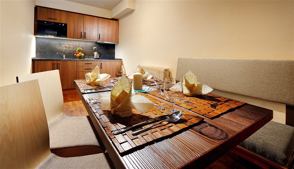 Apartmán, vybavená kuchyňka s jídelním stolem, obývací prostor s rozkládací pohovkou (dvě plnohodnotná lůžka) a sofa (možnost přistýlky), ložnice (manželská postel), koupelna (sprcha, WC, fén), SAT TV, telefon, Wi-Fi (zdarma).