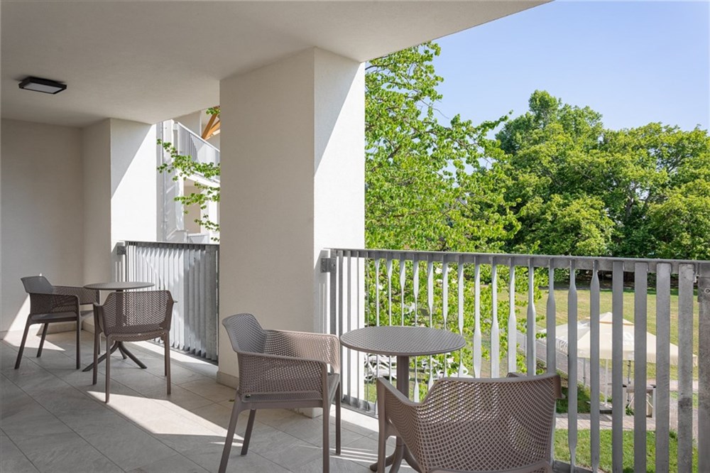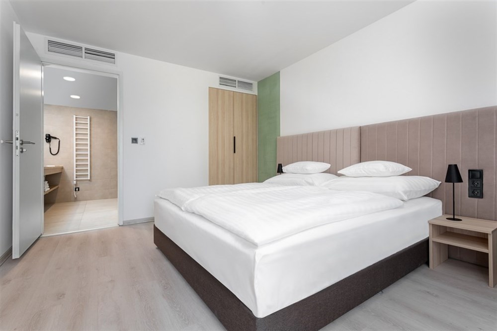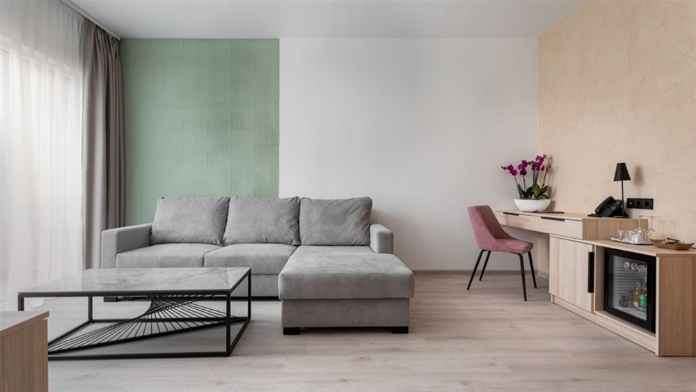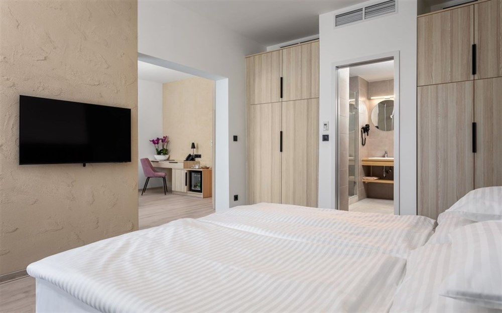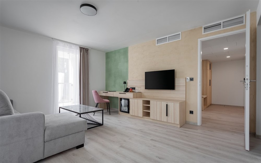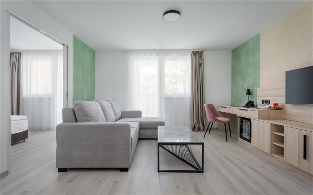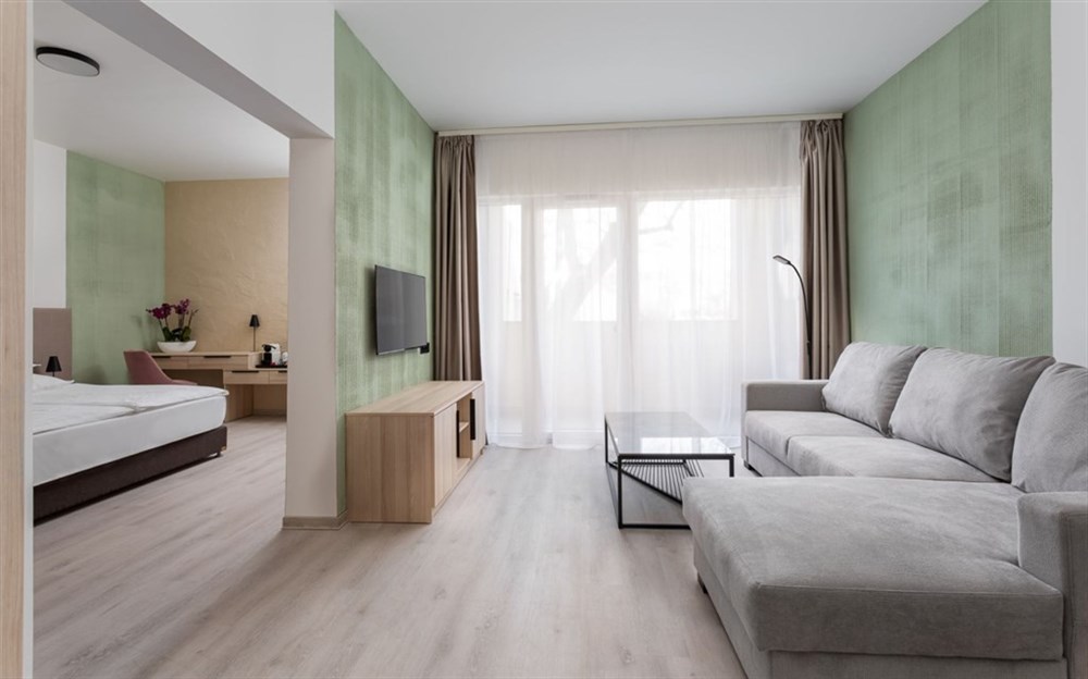 Apartman Junior 52 m2, klidová část lůžka 2x 90x200, částečně oddělená obývací část s rozkládací pohovkou (možnost přistýlky 160x200 cm), koupelna (sprcha, WC, fén, župan), LED TV, telefon, trezor, minibar, klimatizace, balkón, Wi-Fi. Pokoje se nacházejí v přízemí a mají výhled do dvora.