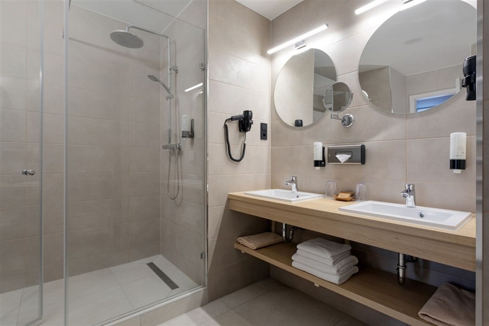 Dvoulůžkové pokoje Standard 23 m2, lůžka 2x 90x200, koupelna (sprcha, WC, fén, župan), LED TV, telefon, trezor, minibar, klimatizace, balkón, Wi-Fi. Pokoje se nacházejí v prvním a druhém patře a mají výhled na vnitřní terasu nebo garáže.