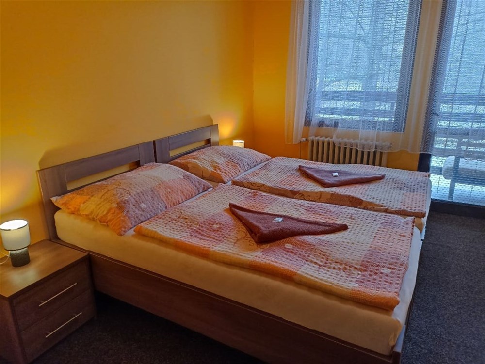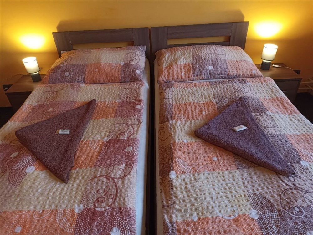 Apartmán LUX, propojené dva pokoje s dvoulůžkem, vlastní koupelna (WC, sprchový kout), TV, Wi-Fi (zdarma). Pobyt se psem je povolen.