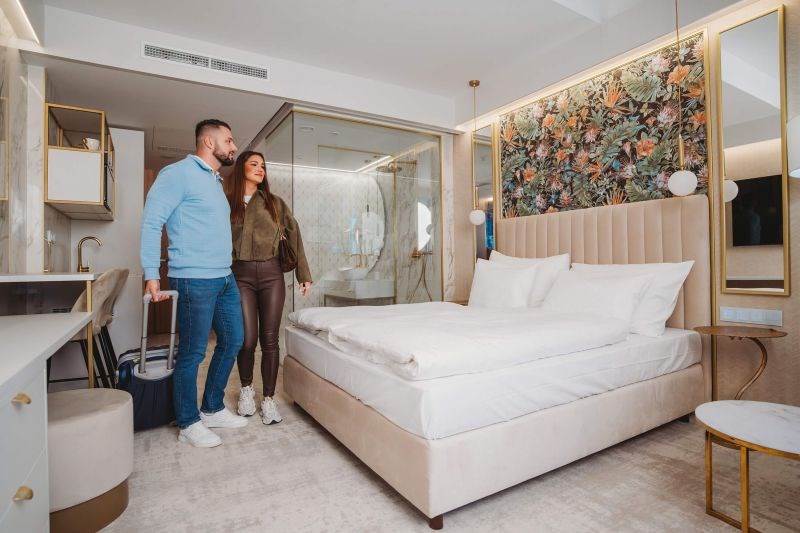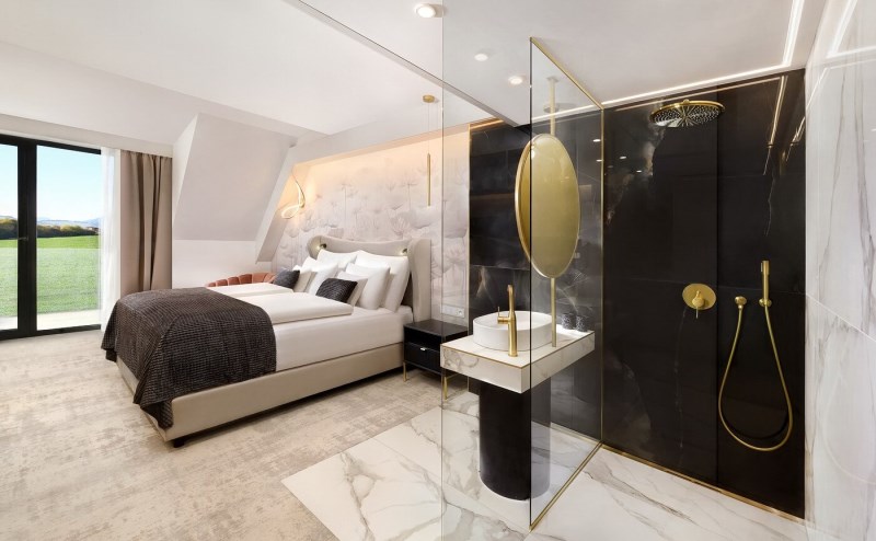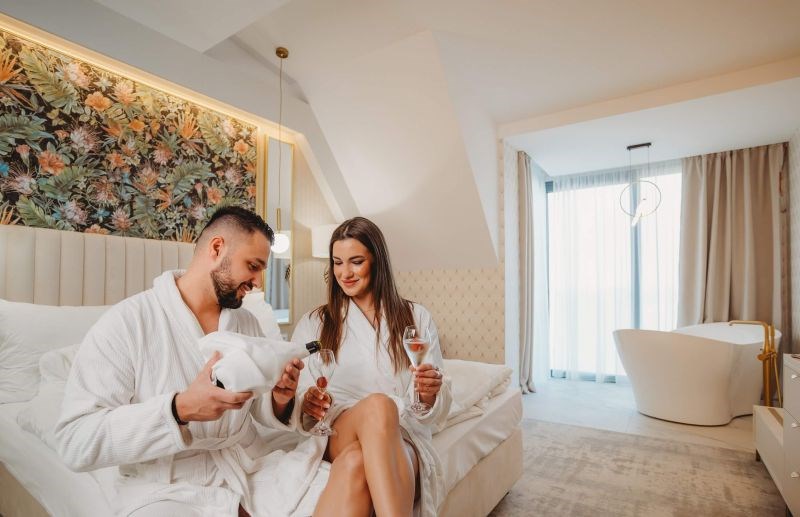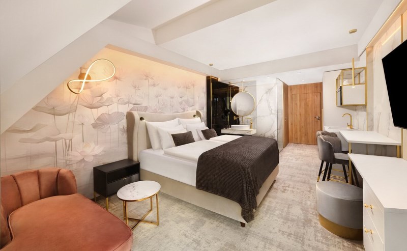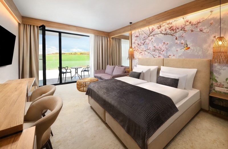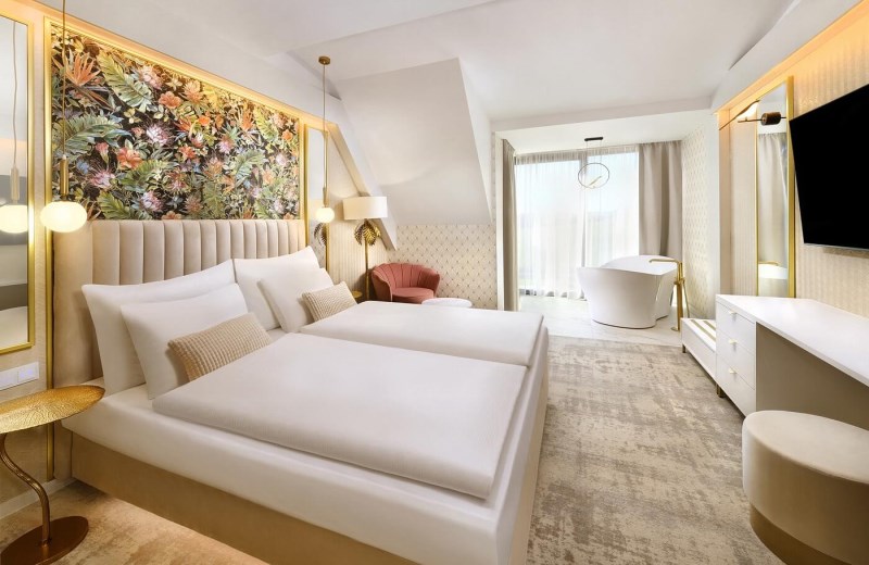 Apartmán Exclusive s privátní vířivkou, 44,55 m², ložnice s možností manželské nebo oddělených postelí, televize je umístěna v obývací části apartmánu, nikoli v ložnici, abyste si v noci užili skutečný klid. Nechybí prostorná terasa s privátní vířivkou, která vám umožní dopřát si relax pod hvězdami nebo vychutnat sklenku vína při západu slunce. Srdcem apartmánu je denní část, kde najdete plně vybavenou kuchyňskou linku a pohodlnou pohovku, kterou lze jednoduše rozložit na přistýlku. Koupelna se sprchovým koutem, WC.Vybavení pokoje: úložný prostor, satelitní TV a telefon, bezplatné WiFi, fén, župany na pokoji, trezor, kuchyň, lednice, myčka, keramická dvouplotýnka, mikrovlnná trouba, varná konvice, kávovar, klimatizace, ručníky a osušky a také extra osušky do wellness.Apartmán LUX, od 41,51 m², prostorná ložnici s možností manželské nebo oddělených postelí a velkorysou terasu, ze které máte přímý vstup do zahrady a krásný výhled na východ slunce. Součástí apartmánu je také oddělená obývací část, kde najdete pohodlnou pohovku a televizi.Pohovka může sloužit jako přistýlka pro jednu nebo dvě osoby, takže každý host má dostatek pohodlí. K dispozici je koupelna se sprchovým koutem, WC). Vybavení pokoje: Úložný prostor, satelitní TV a telefon, bezplatné WiFi, fén, župany na pokoji, trezor, kuchyň, lednice, myčka, keramická dvouplotýnka, mikrovlnná trouba, varná konvice, kávovar, klimatizace, ručníky a osušky a také extra osušky do wellness.Apartmán, od 41,72 m², nabízí komfortní ložnici s možností manželské nebo oddělených postelí a útulný interiér, který vás obklopí pohodlím a atmosférou domova. Obývací část je vybavena pohodlnou pohovkou a televizí, přičemž pohovka může sloužit jako přistýlka pro jednu nebo dvě osoby, včetně podkrovních apartmánů, kde je manželská postel k dispozici pouze jako dvoulůžko bez možnosti oddělených postelí. Všechny apartmány mají sprchový kout + WC, který doplňuje moderní komfort ubytování. Vybavení pokoje: Úložný prostor, satelitní TV a telefon, bezplatné WiFi, fén, župany na pokoji, trezor, kuchyň, lednice, myčka, keramická dvouplotýnka, mikrovlnná trouba, varná konvice, kávovar, klimatizace, ručníky a osušky a také extra osušky do wellness.Apartmán s panoramatickým výhledem, od 44,24 m², rohový apartmán orientovaný i na východ vás okouzlí velkým panoramatickým oknem s pohodlnou pohovkou ve výklenku, kde si můžete vychutnat ranní kávu. Apartmán má vlastní balkon, ideální pro relax či chvíle pohody na čerstvém vzduchu. Komfortní ložnice poskytuje možnost manželské nebo oddělených postelí, přičemž v podkrovní verzi je k dispozici pouze manželská postel. Obývací část je samostatně vybavena pohodlnou pohovkou a televizí, přičemž pohovka může sloužit jako přistýlka pro jednu nebo dvě osoby, ideální pro rodiny. Všechny apartmány mají sprchový kout + WC, který doplňuje moderní komfort a praktičnost ubytování. Tyto apartmány jsou exkluzivní. K dispozici jsou pouze dva. Vybavení: úložný prostor, satelitní TV a telefon, bezplatné WiFi, fén, župany na pokoji, trezor, kuchyň, lednice, myčka, keramická dvouplotýnka, mikrovlnná trouba, varná konvice, kávovar, klimatizace, ručníky a osušky a také extra osušky do wellness.Studio Garden, od 27,54 m², studio s balkonem, komfortní ložnice s možností manželské nebo oddělených postelí a je ideální volbou pro páry i menší rodiny, které hledají útulné a pohodlné ubytování spojující soukromí, komfort a dovolenkovou atmosféru. Tento útulný prostor je doplněn o pohodlnou pohovku, která slouží jako přistýlka buď pro jednu, nebo dvě osoby. V podkrovních studiích je určena pouze pro jednu osobu. Hosté mají k dispozici sprchový kout + WC, který doplňuje promyšlený komfort studia. Studia jsou v hotelu umístěna na všech podlažích. Vybavení pokoje: úložný prostor, satelitní TV a telefon, bezplatné WiFi, fén, župany na pokoji, trezor, kuchyň, lednice, myčka, keramická dvouplotýnka, mikrovlnná trouba, varná konvice, kávovar, klimatizace, ručníky a osušky a také extra osušky do wellness.Ensuite Studio, od 27,56 m², je ideální pro páry, které hledají kompaktní, ale nadstandardně komfortní ubytování. Nabízí komfortní ložnici s manželskou postelí vybavenou velkou matrací, která zaručuje příjemný a ničím nerušený spánek. Moderní sprcha typu walk-in, elegantně integrovaná přímo do pokoje, dodává prostoru vzdušnost a otevřený design, který působí sofistikovaně a zároveň útulně. Malá, promyšleně zařízená kuchyňka s lednicí a mikrovlnkou umožňuje připravit si lehké občerstvení nebo ranní kávu přesně podle vaší nálady. Součástí studia je také balkon, ze kterého se otevírá příjemný výhled na bazény, čímž váš pobyt získává atmosféru pohody a uvolnění. Toto studio není obyčejným pokojem – je promyšleně navrženo pro páry, které ocení kombinaci soukromí, pohodlí a elegantního designu, čímž se stává ideálním místem pro relaxační a nezapomenutelný pobyt. Vybavení pokoje: úložný prostor, satelitní TV a telefon, bezplatné WiFi, fén, župany na pokoji, trezor, kuchyň, lednice, mikrovlnná trouba, varná konvice, kávovar, klimatizace, ručníky a osušky a také extra osušky do wellness.Ensuite Studio s masážní vanou, 31,65 m², podkrovní studio je dokonalou volbou pro páry, které touží po luxusnějším zážitku. Komfortní ložnice s manželskou postelí a moderní walk-in sprchou elegantně integrovanou přímo do pokoje dotváří otevřený prostor, kde se snoubí zajímavý design s pocitem domácí pohody. Malá, praktická kuchyňka s lednicí a mikrovlnkou umo