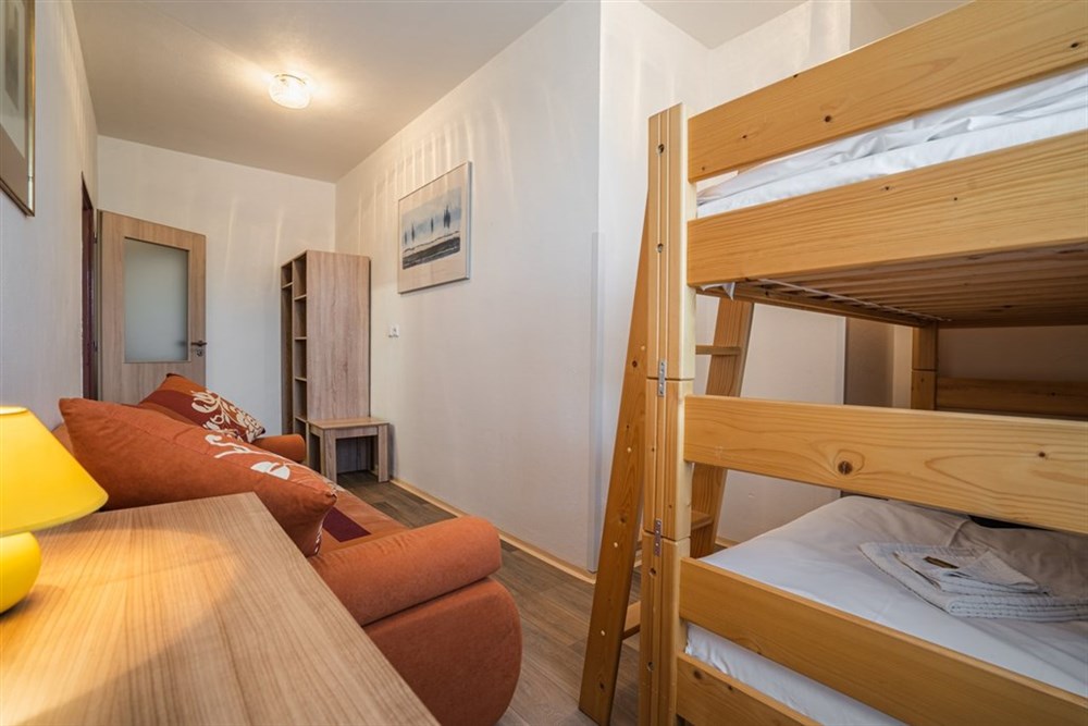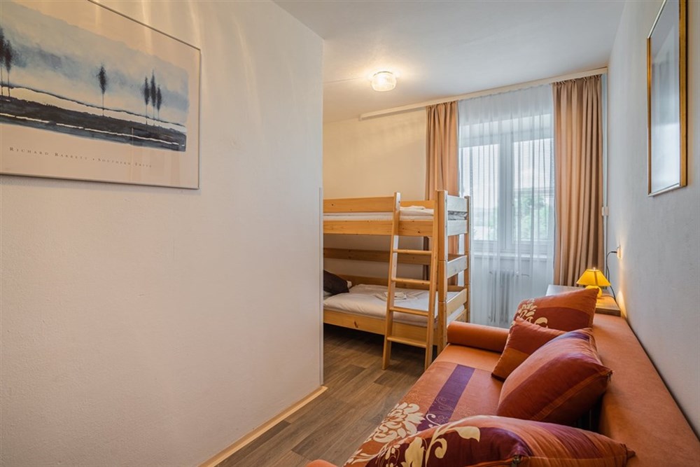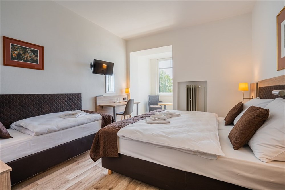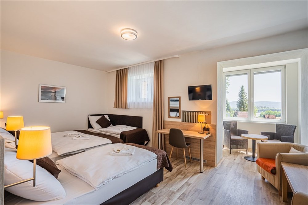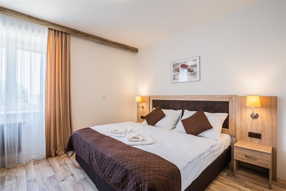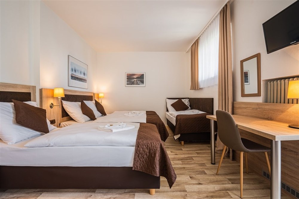 Hotel má pohodlné, standardně vybavené pokoje, některé s palandami.Dvoulůžkové pokoje, vlastní soc. zařízení (sprcha, WC), TV-SAT, Wi-Fi. Některé s možností až 2 přistýlek.Tří a čtyřlůžkové pokoje, vlastní soc. zařízení (sprcha, WC), TV-SAT, Wi-Fi. Rodinné pokoje pro 5 osob.