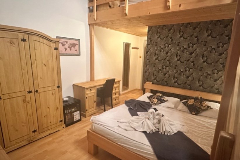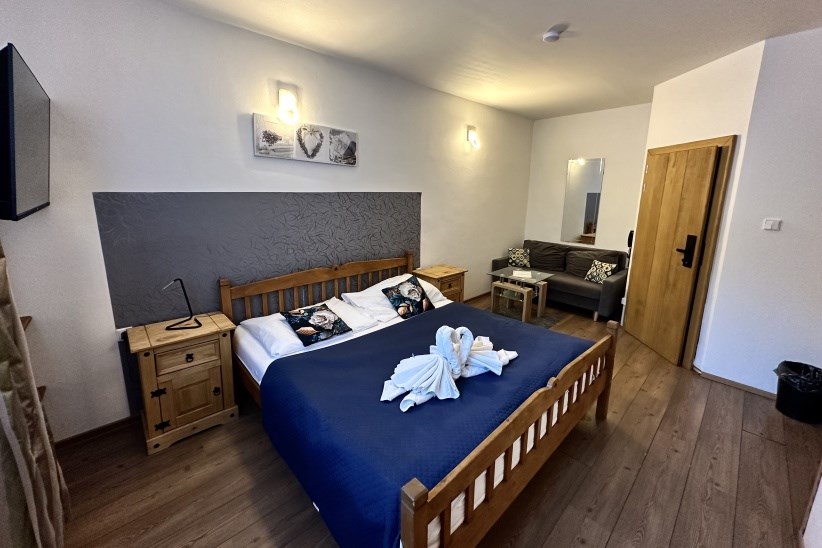 2lůžkový pokoj č. 101, pro až 5 osob s mezonetem, koupelna (sprcha a WC), TV SAT, trezor, minibar, Wi-Fi (zdarma).2lůžkový pokoj č. 102, dvoulůžkový pokoj, možnost přistýlky, koupelna (sprcha a WC), TV SAT, trezor, minibar, Wi-Fi (zdarma). Lze propojit s pokojem č. 101 v jeden apartmán pro až 7 osob.2lůžkové pokoje, manželská postel nebo oddělená lůžka, možnost přistýlky, koupelna (sprcha a WC), TV SAT, trezor, minibar, Wi-Fi (zdarma).3lůžkové pokoje, možnost přistýlky, koupelna (sprcha a WC), TV SAT, trezor, minibar, Wi-Fi (zdarma).4lůžkové pokoje, patrové postele nebo oddělená lůžka, možnost přistýlky, koupelna (sprcha a WC), TV SAT, trezor, minibar, Wi-Fi (zdarma).Rodinné 4lůžkové pokoje, ložnice a dva pokojíčky, možnost přistýlky, koupelna (sprcha a WC), TV SAT, trezor, minibar, Wi-Fi (zdarma).5-6ůžkové pokoje, patrová postel nebo mezonet, možnost přistýlky, koupelna (sprcha a WC), TV SAT, trezor, minibar, Wi-Fi (zdarma).3lůžkový V.I.P. pokoj č. 201 ve 2. poschodí, možnost přistýlky, koupelna (sprcha a WC), TV SAT, trezor, minibar, Wi-Fi (zdarma).4lůžkový V.I.P. pokoj č. 200 ve 2. poschodí s podkrovím, možnost přistýlky, koupelna (infrasauna, sprcha a WC), obývací pokoj s posezením, elektrickým krbem a TV SAT; trezor, minibar, Wi-Fi (zdarma). Lze propojit s pokojem č. 201 v jeden apartmán pro až 7 osob.Rodinný apartmán ve 4.NP, luxusní, prostorný pro až 9 osob, tři prostory na spaní a obytná kuchyň (vybavená funkční) s rozkládacím gaučem (možnost přistýlek), možnost dětské postýlky, moderní nábytek, 2 velké TV, moderní koupelna a oddělená toaleta, dětský koutek a šatna. V tomto apartmá není možno ubytovat domácí mazlíčky.